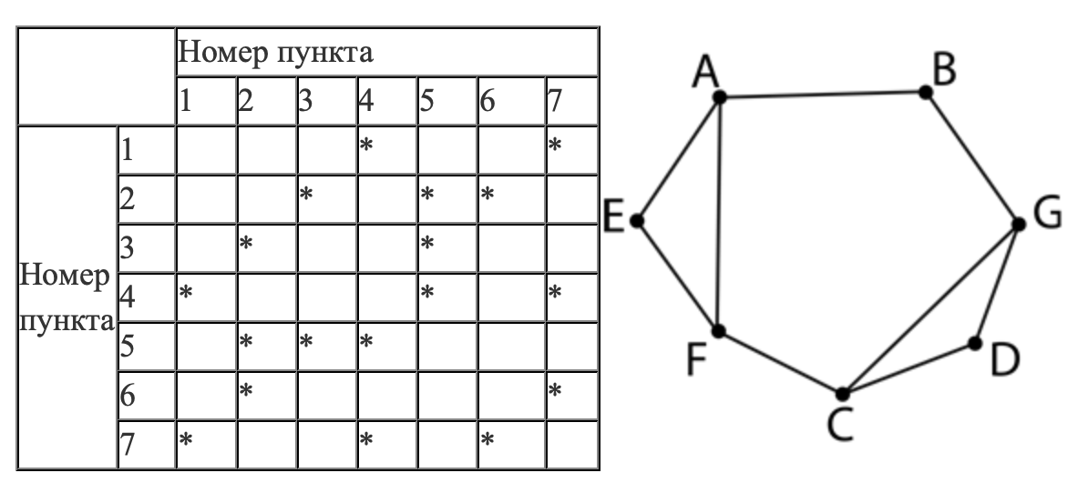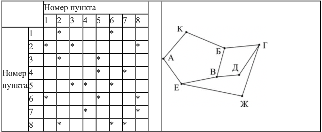 В таблице содержатся сведения о дорогах между населёнными пунктами (звёздочка означает, что дорога между соответствующими городами есть).