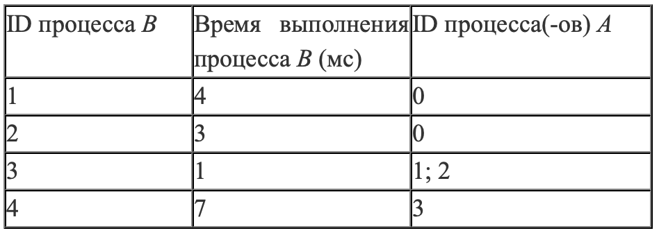 с разделителем «;» ID процессов, от которых зависит данный процесс. Если процесс является независимым, то в таблице указано значение 0.