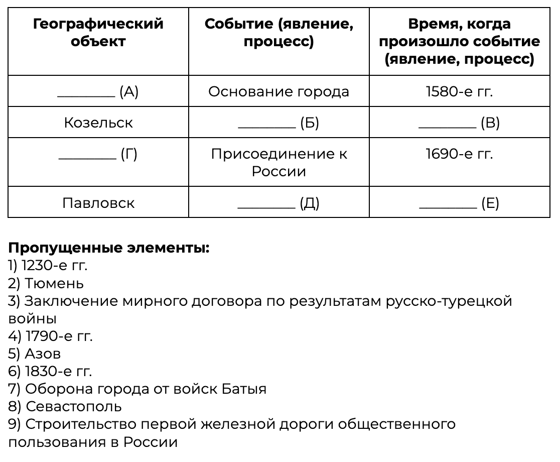 Заполните пустые ячейки таблицы, используя приведённый ниже список пропущенных элементов: для каждого пропуска, обозначенного буквой, выберите номер нужного элемента.