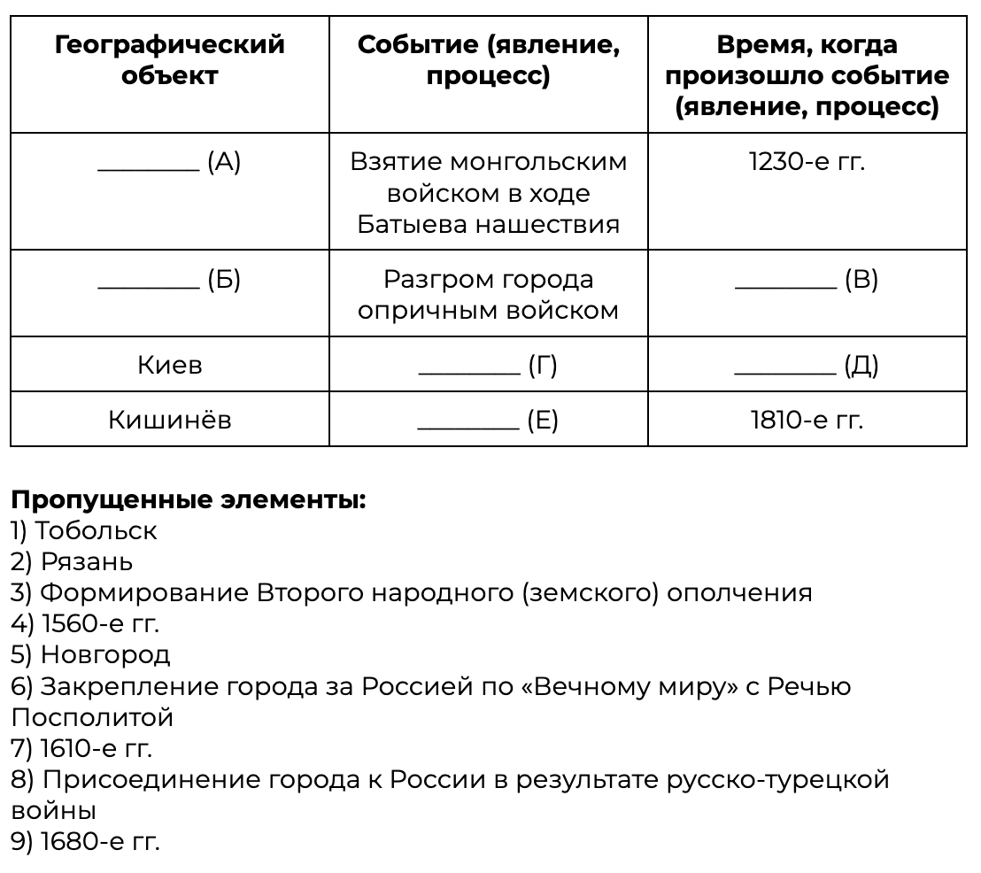 Заполните пустые ячейки таблицы, используя приведённый ниже список пропущенных элементов: для каждого пропуска, обозначенного буквой, выберите номер нужного элемента.