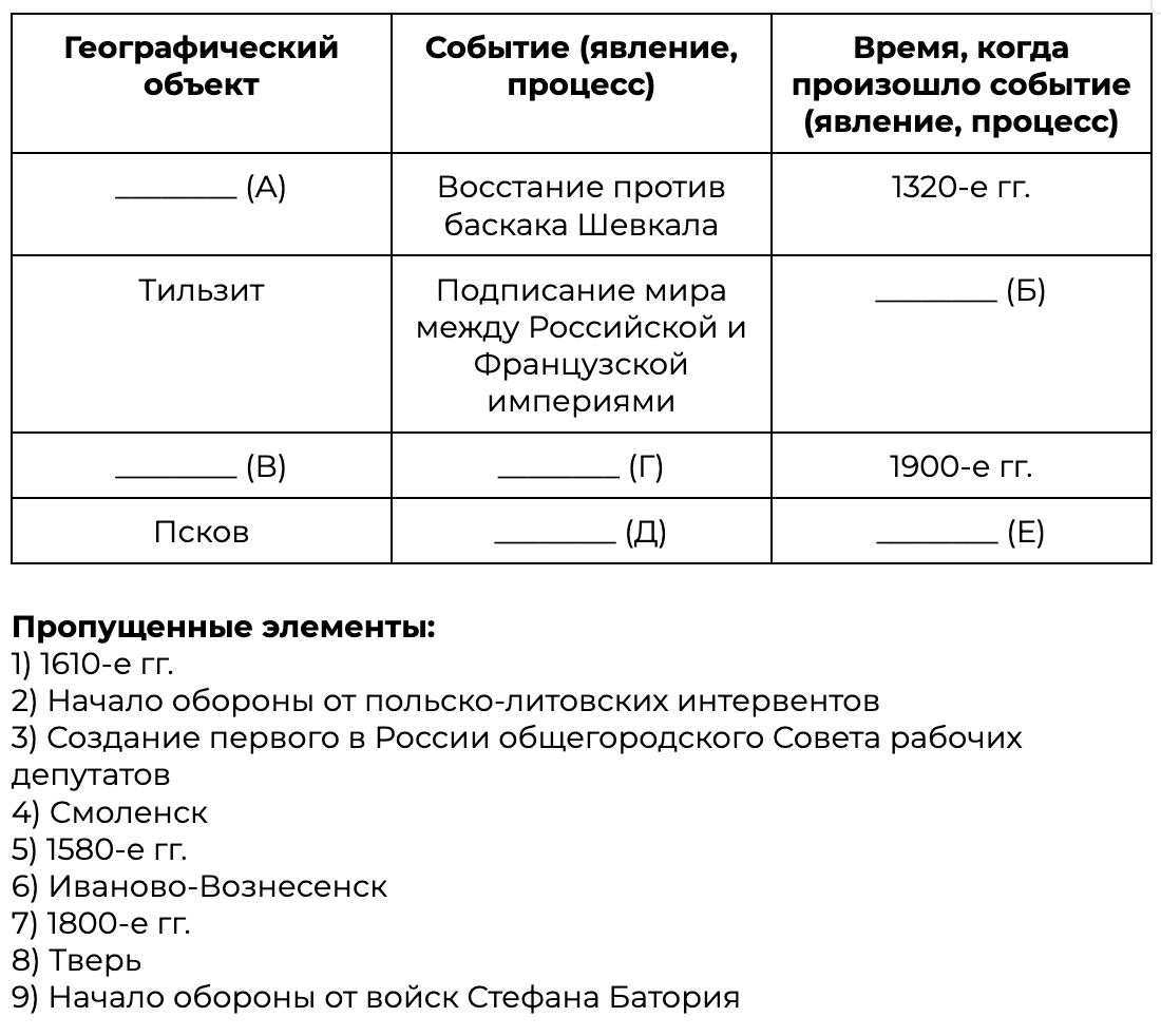 Заполните пустые ячейки таблицы, используя приведённый ниже список пропущенных элементов: для каждого пропуска, обозначенного буквой, выберите номер нужного элемента.