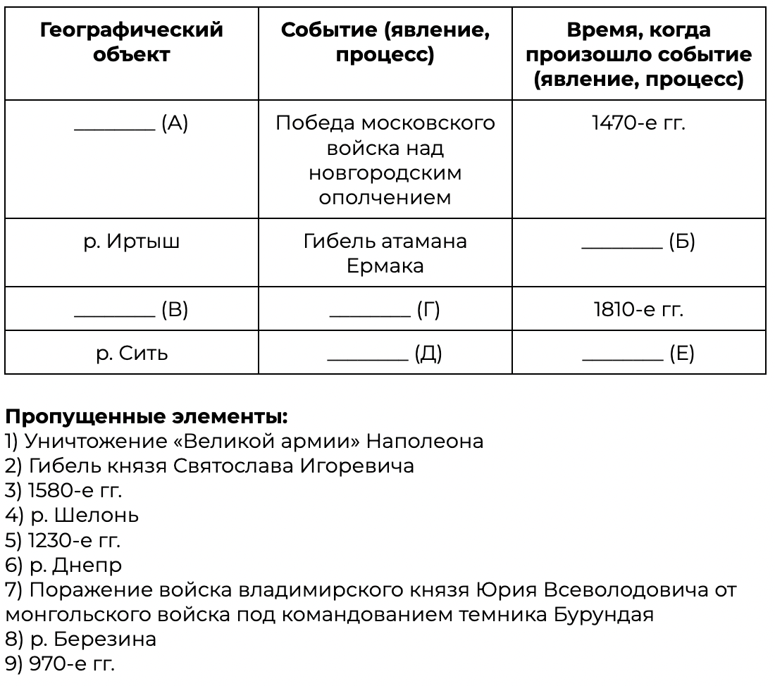 Заполните пустые ячейки таблицы, используя приведённый ниже список пропущенных элементов: для каждого пропуска, обозначенного буквой, выберите номер нужного элемента.