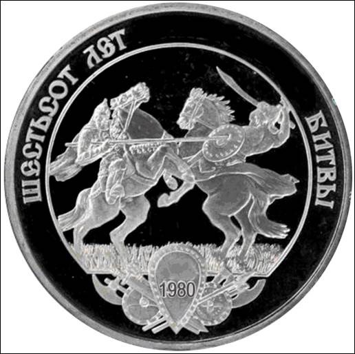 Назовите московского князя, возглавившего русское войско в битве, юбилею которой посвящена монета. Используя изображение, приведите одно любое обоснование Вашего ответа.