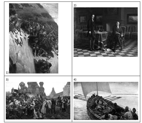 Какое из произведений живописи посвящено событию, произошедшему в том же десятилетии, когда был основан город, юбилею которого посвящена марка? В ответе запишите цифру, которой обозначено это произведение живописи. Укажите художника, создавшего данное произведение живописи.