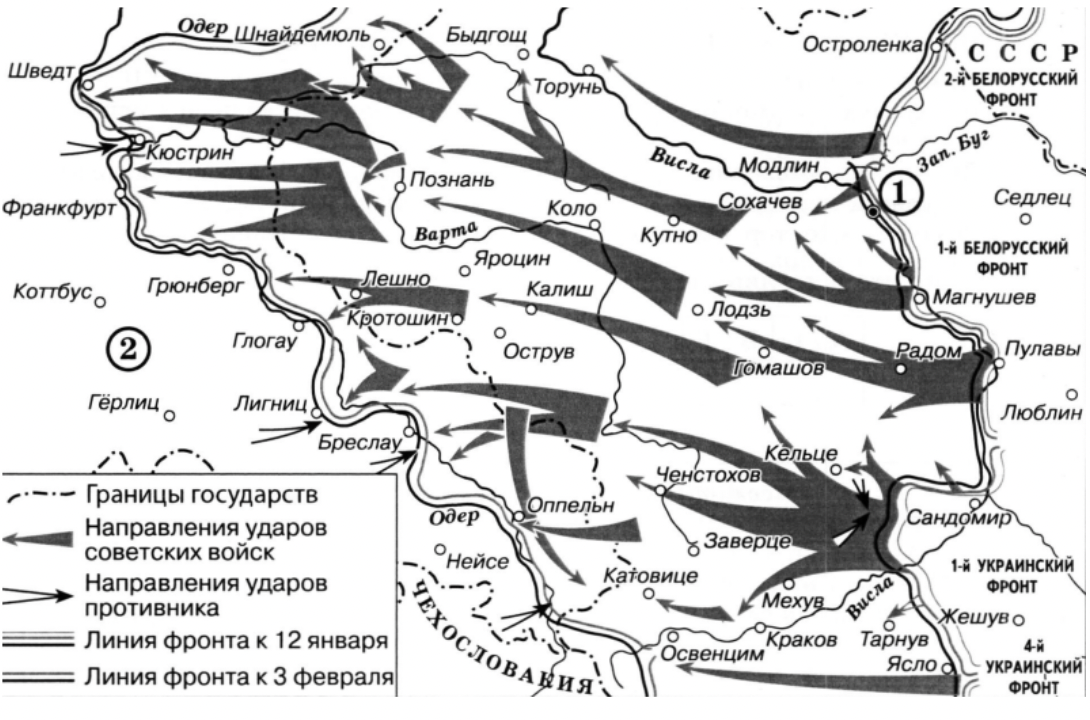 «Германское командование начало переброску в приграничные районы части сил из внутренних районов Германии, с Западного фронта и других участков фронта. Однако попытки восстановить прорванный фронт успеха не имели. 20-25 января армии 1-го Белорусского фронта преодолели вартовский и познанский оборонительные рубежи и окружили в Познани 60-тысячный гарнизон противника. 22 января — 3 февраля советские войска вышли на реку ________________ и захватили плацдармы на его западном берегу в районах Бреслау, Оппельна и Кюстрина».