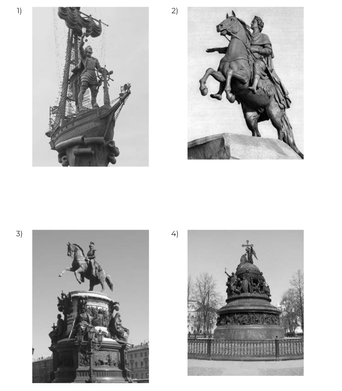 Какой из представленных ниже скульптурных памятников был создан после события, которому посвящена марка? В ответе запишите цифру, которой обозначен этот скульптурный памятник. Укажите автора этого скульптурного памятника.