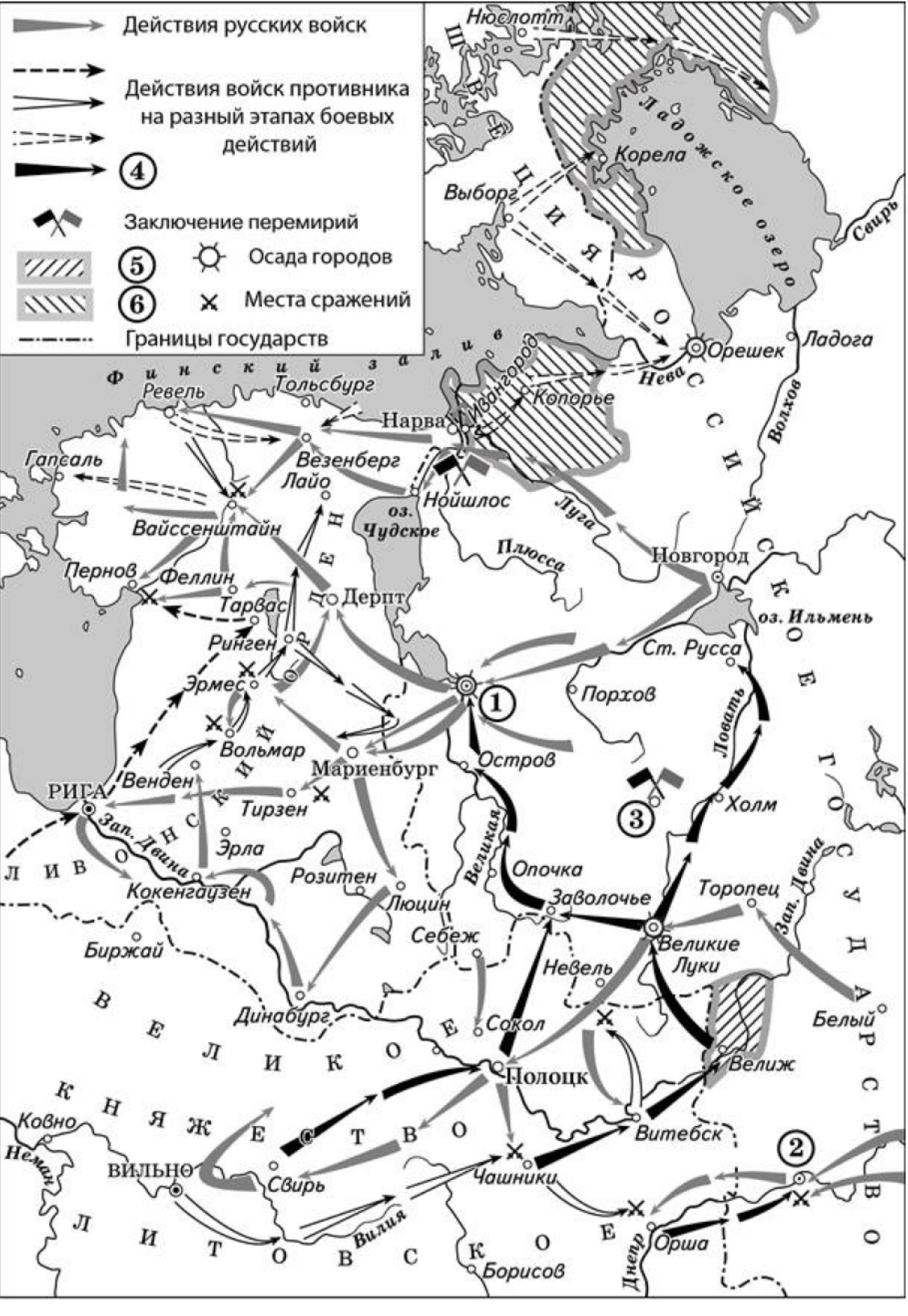 «Передовой полк русских войск двинулся к Мариенбургу, а затем западнее, к Тирзену, где в январе произошло крупное сражение между русскими и ливонскими войсками. Ливонцы потерпели поражение, их предводитель Фридрих фон Фёлькерзам погиб. Одержав победу, русская армия двинулась далее, в глубь Ливонии, к побережью Балтийского моря. Дойдя до ___________, русские войска разгромили окрестности города и сожгли часть ливонского флота, скованного льдом. От ____________ русские войска двинулись на юг вдоль Западной Двины».