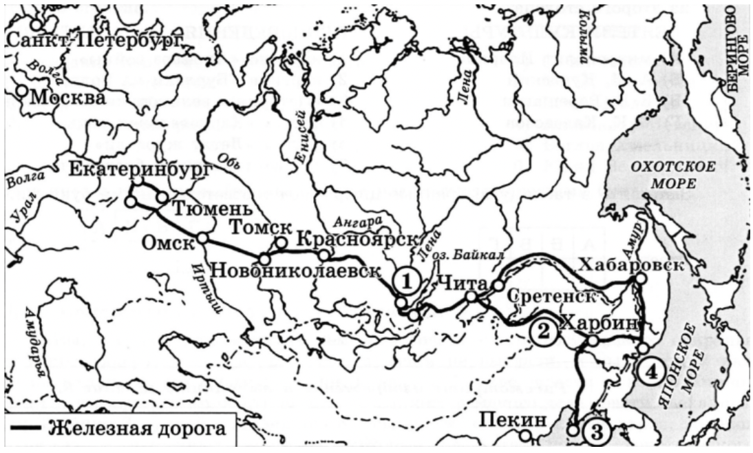 Заполните пропуск в предложении: «Строительство железной дороги, обозначенной на схеме, началось в тысяча восемьсот ______ годах» (укажите десятилетие).
