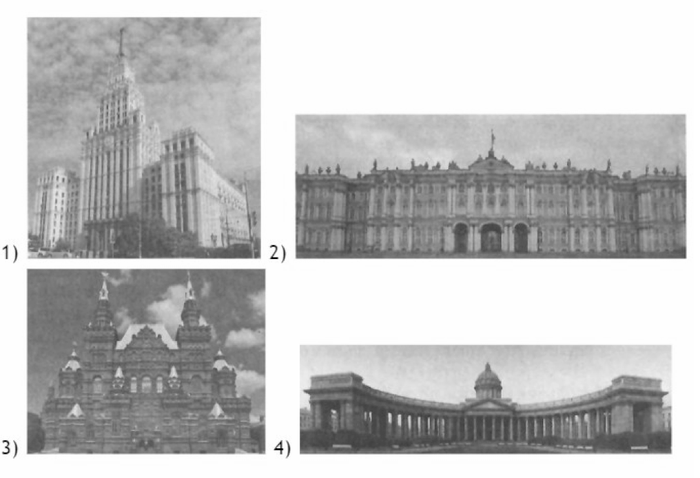 Какой из представленных ниже памятников архитектуры был создан в период жизни исторического деятеля, изображенного на марке? В ответе запишите цифру, которой обозначен этот памятник архитектуры. Укажите город, в котором находится данный памятник архитектуры.