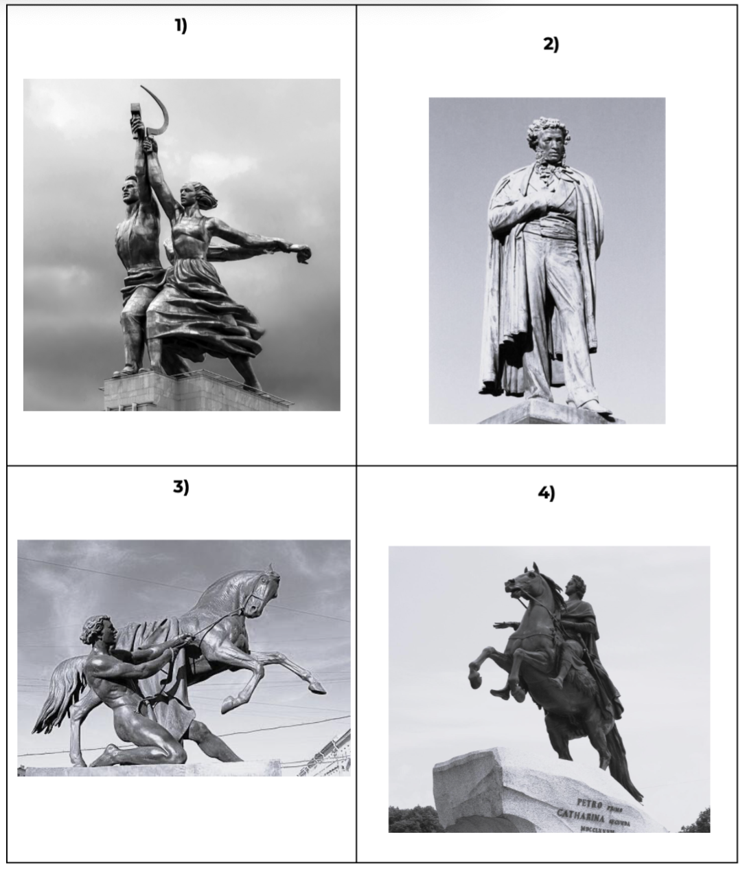 Какой из представленных ниже скульптурных памятников был создан в период жизни исторического деятеля, изображенного на монете? В ответе запишите цифру, которой обозначен этот скульптурный памятник. Назовите скульптора, по проекту которого создан данный скульптурный памятник.