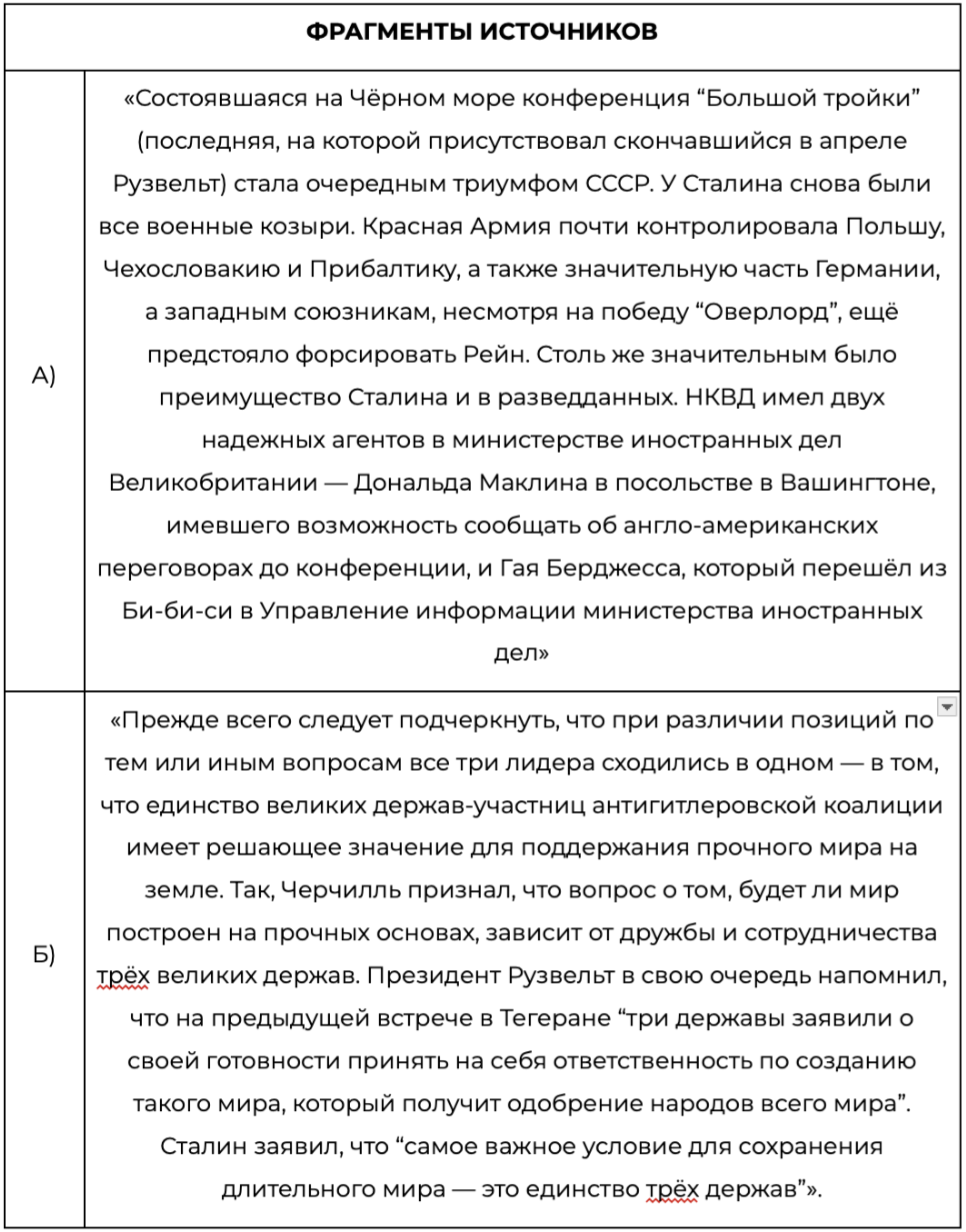 Укажите город, где состоялась конференция, о которой идёт речь в обоих представленных отрывках. Укажите год, когда состоялась первая из конференций «Большой тройки», проходивших в годы Великой Отечественной войны. Что, согласно одному из отрывков, по мнению И.В. Сталина, было важнейшим условием для сохранения длительного мира?