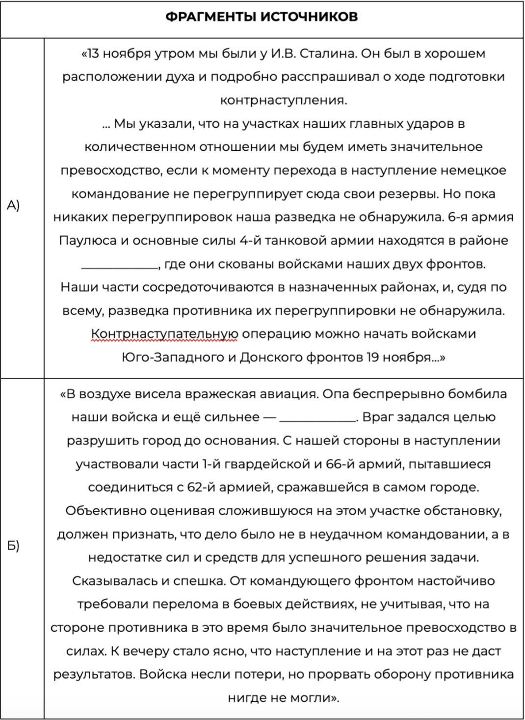 Укажите название города, пропущенное в обоих представленных отрывках, в период, когда происходили события, о которых в них идёт речь. Назовите одного любого командующего фронтом, участвовавшего в стратегической наступательной операции советских войск, с целью окружения и уничтожения вражеской группировки в районе города, название которого пропущено в обоих отрывках. Приведите одну любую причину безрезультатности наступления советских войск, на которую указывает автор одного из отрывков.