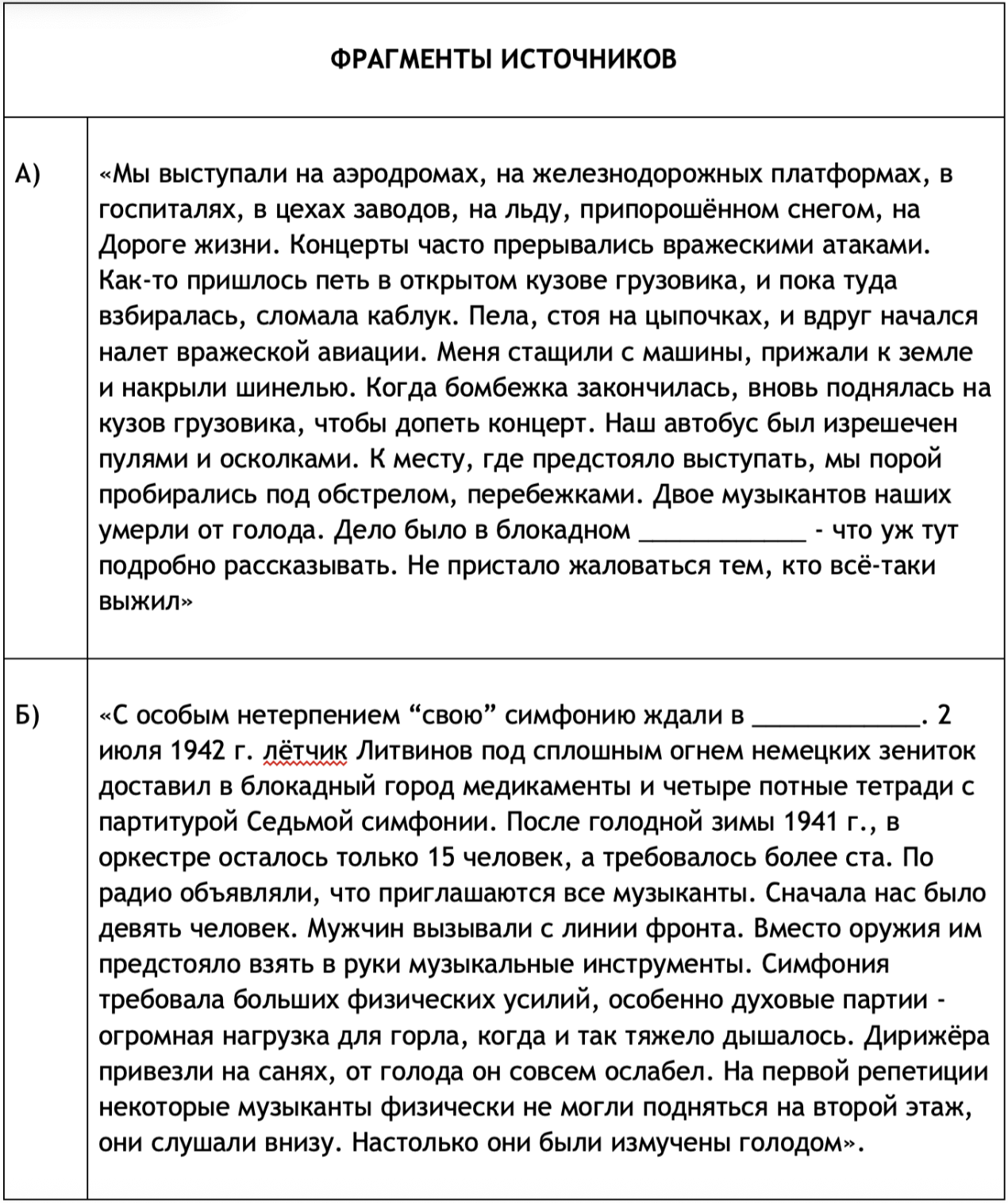 Укажите город, название которого пропущено в обоих отрывках, в пернод. когда происходили описанные в них события. Назовите любого деятеля советской культуры, своим творчеством внёсшего вклад в победу нашей страны в Великой Отечественной войне. Как, по свидетельству автора одного из отрывков, шло пополнение оркестра?