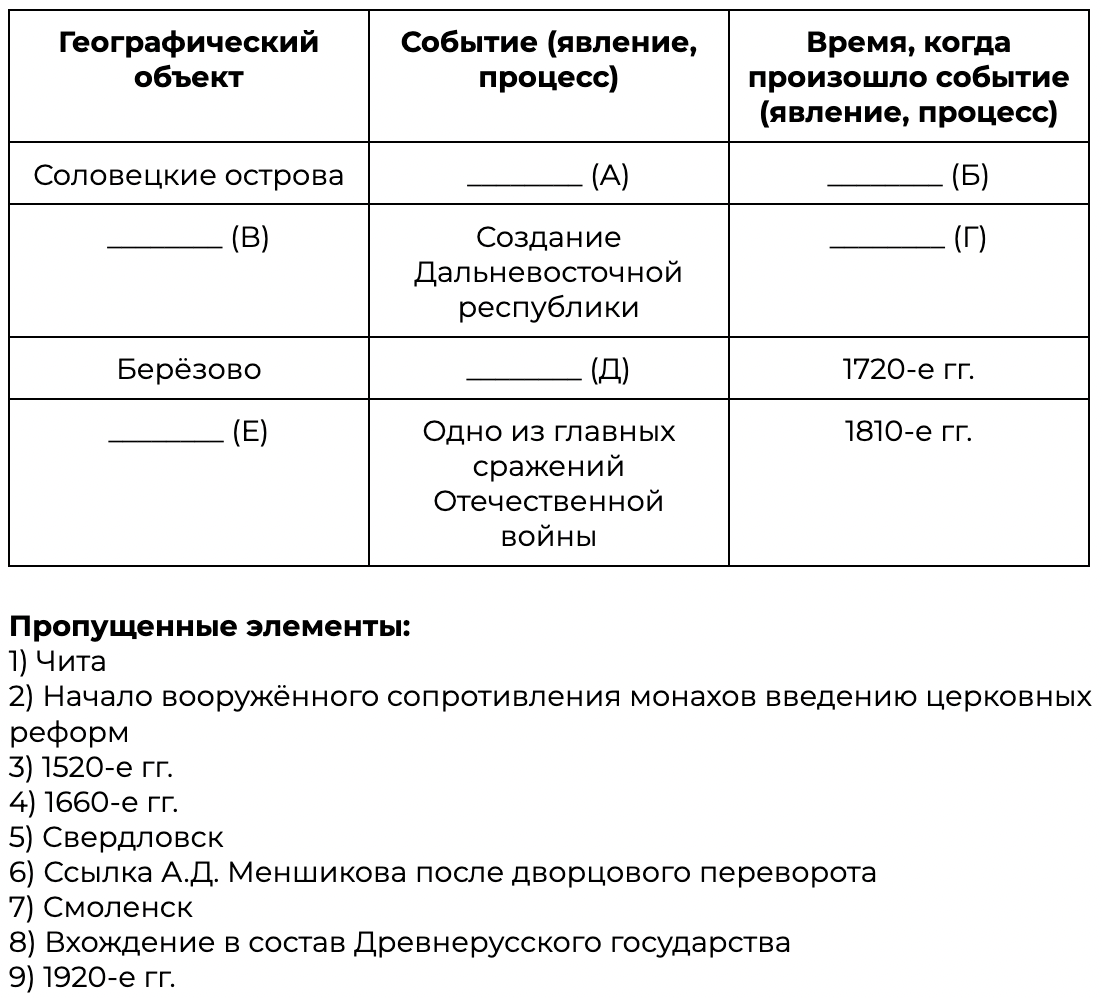 Заполните пустые ячейки таблицы, используя приведённый ниже список пропущенных элементов: для каждого пропуска, обозначенного буквой, выберите номер нужного элемента.