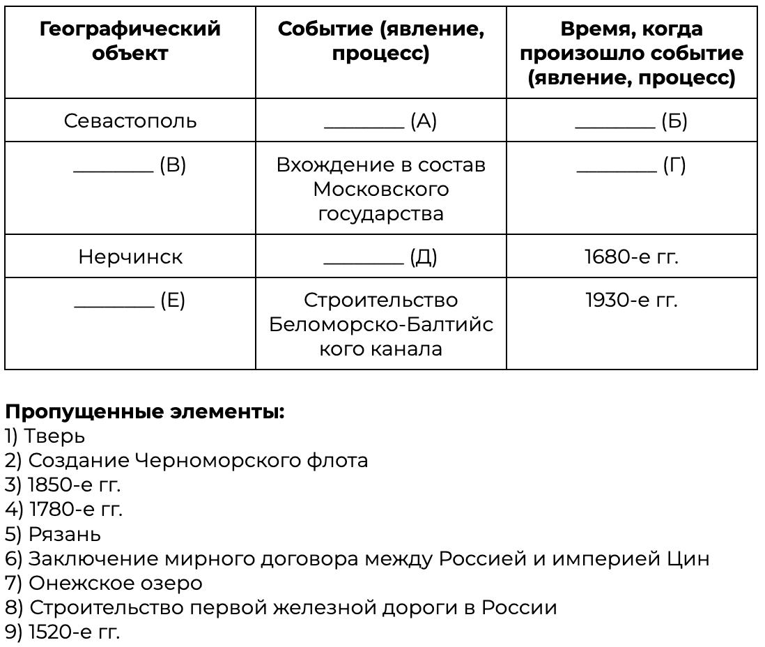 Заполните пустые ячейки таблицы, используя приведённый ниже список пропущенных элементов: для каждого пропуска, обозначенного буквой, выберите номер нужного элемента.