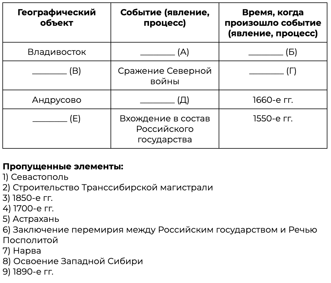 Заполните пустые ячейки таблицы, используя приведённый ниже список пропущенных элементов: для каждого пропуска, обозначенного буквой, выберите номер нужного элемента.