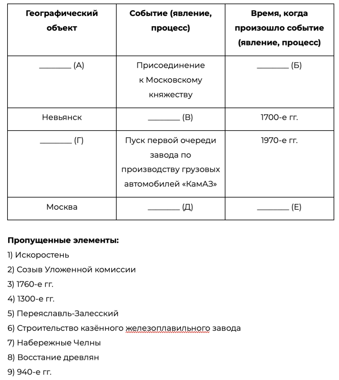 Заполните пустые ячейки таблицы, используя приведённый ниже список пропущенных элементов: для каждого пропуска, обозначенного буквой, выберите номер нужного элемента.