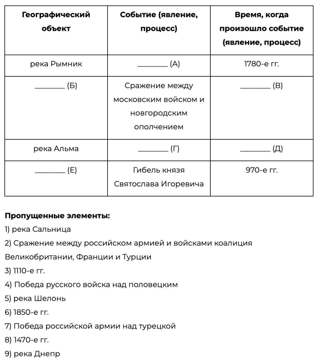 Заполните пустые ячейки таблицы, используя приведённый ниже список пропущенных элементов: для каждого пропуска, обозначенного буквой, выберите номер нужного элемента.