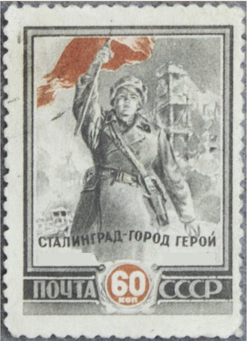 Рассмотрите изображение и выполните задание. Укажите название месяца, когда завершилась битва за город, названный на марке.