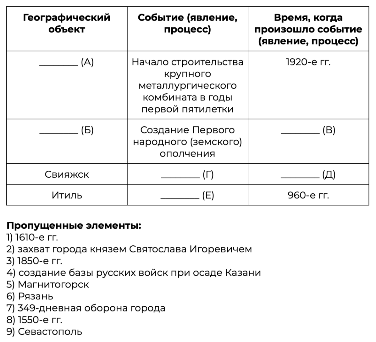 Заполните пустые ячейки таблицы, используя приведённый ниже список пропущенных элементов: для каждого пропуска, обозначенного буквой, выберите номер нужного элемента.