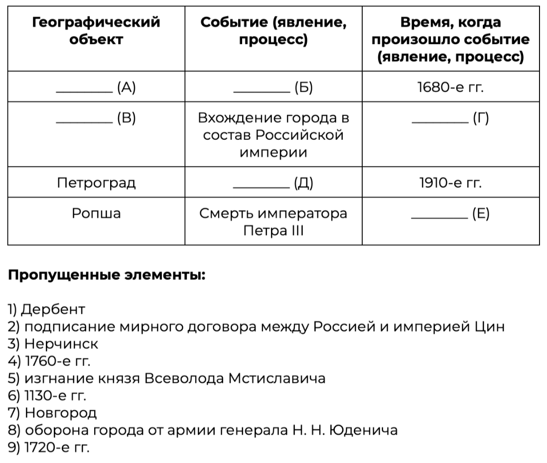 Заполните пустые ячейки таблицы, используя приведённый ниже список пропущенных элементов: для каждого пропуска, обозначенного буквой, выберите номер нужного элемента.