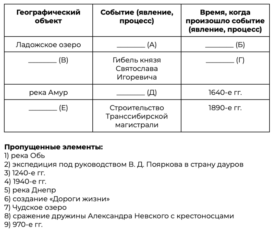 Заполните пустые ячейки таблицы, используя приведённый ниже список пропущенных элементов: для каждого пропуска, обозначенного буквой, выберите номер нужного элемента.