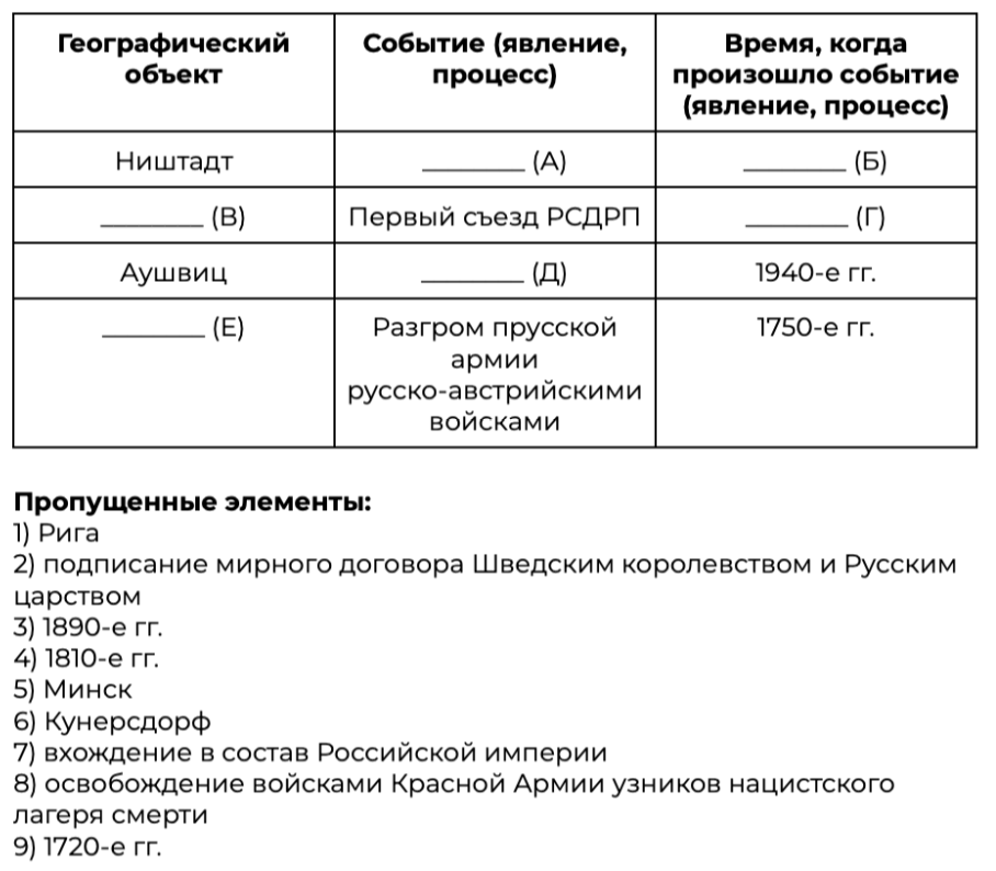 Заполните пустые ячейки таблицы, используя приведённый ниже список пропущенных элементов: для каждого пропуска, обозначенного буквой, выберите номер нужного элемента.