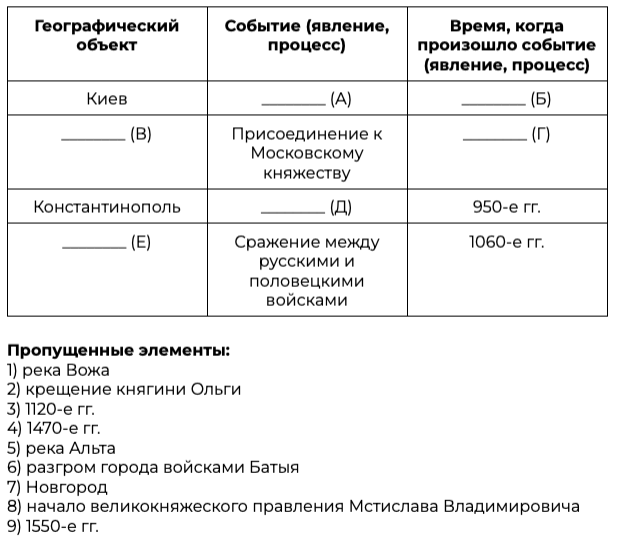 Заполните пустые ячейки таблицы, используя приведённый ниже список пропущенных элементов: для каждого пропуска, обозначенного буквой, выберите номер нужного элемента.