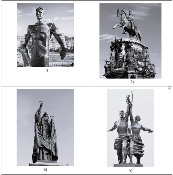Какой из представленных ниже скульптурных памятников был создан при том же руководители СССР, при котором был выпущен данный плакат? В ответе запишите цифру, которой обозначен этот скульптурный памятник. Укажите стиль, в котором создан данный скульптурный памятник.
