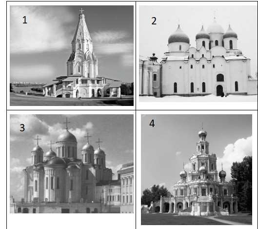 Какой из представленных ниже памятников архитектуры был создан в том же веке, когда произошло событие, юбилею которого посвящён данный памятный знак? В ответе запишите цифру, которой обозначен этот памятник архитектуры. Укажите стиль, в котором создан данный памятник архитектуры.