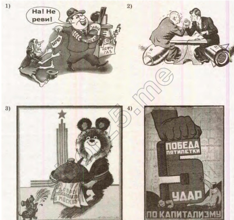 Какая из представленных ниже карикатур была посвящена событию (процессу), произошедшему в СССР не более чем за 10 лет до события, которому посвящён плакат? В ответе запишите цифру, которой обозначена эта карикатура. Назовите событие (процесс), которому посвящена данная карикатура.