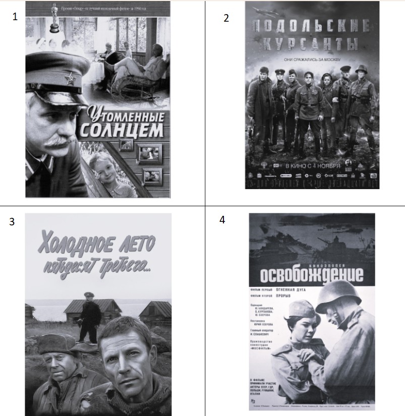 Какой из фильмов, афиши которых представлены ниже, был создан в том же десятилетии, когда этот исторический деятель стал руководителем СССР? В ответе запишите цифру, которой обозначена афиша. Назовите историческое событие (процесс), с которым связано название фильма.