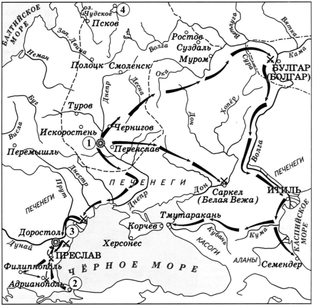 «Русский князь вёл войско только по одному ему известному замыслу. По пути захватывались табуны свежих коней. Близился край хазарских владений и побережье Азовского моря. Сильная неприятельская приморская крепость ____________, находившаяся в дельте реки Кубань, была взята.