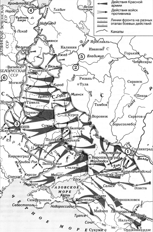 Заполните пропуск в предложении: «Город, обозначенный на схеме цифрой «6», был освобождён от фашистов в тысяча девятьсот _________ году». Ответ запишите в виде слова (словосочетания).