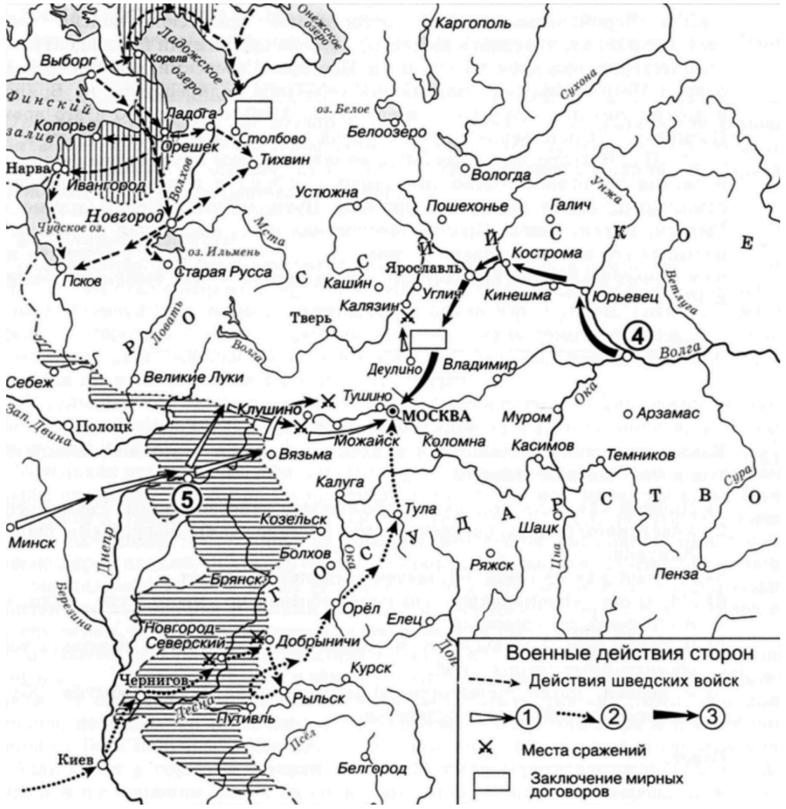 «Войска наступали на Москву кружным путём — через Чернигов и Северскую землю. Черниговцы, вначале встретившие вражеское войско выстрелами, услышали о том, что сдался Моравск, и также присягнули претенденту. Серьёзным препятствием оказался на его пути Новгород-Северский, где заперся с войском боярин Пётр Басманов, получивший серьёзное подкрепление из Брянска, Кром и других соседних городов — всего около 1500 человек. Но в это время сдался Путивль, — единственная в этих краях каменная крепость, ключ к Северской земле. Под Новгородом-Северским состоялось первое крупное сражение, в котором, несмотря на превосходство московского войска в количестве, победу одержал самозванец. В это же время примеру Путивля последовали другие города — Рыльск, Курск, Севск, Кромы. Московская рать, высланная против самозванца, настигла его в конце января у села ________________, где он потерпел поражение из-за многочисленной артиллерии у противника и был вынужден бежать на юг, к Рыльску».
