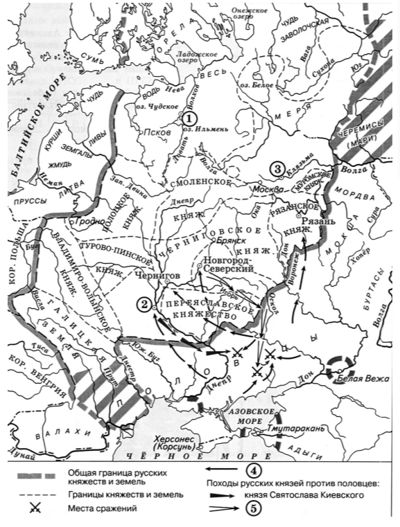 «Появившись в восточноевропейских степях, новые пришельцы неоднократно нарушали границы Руси и опустошали её земли. Будучи на стадии кочевания, они проявляли особую агрессивность. По летописным источникам насчитывается 46 походов половцев на Русь, не считая мелких набегов. Иногда русские вели с половцами и наступательную войну, предпринимали походы вглубь Половецкой земли. Иногда такие походы становились общерусскими мероприятиями. В ходе первого крупного столкновения русских и половцев во главе с ханом Искалом была разбита рать Всеволода Ярославича, разорено Переяславское княжество. Половцы опустошали Русскую землю, дошли до Новгород-Северского и до ____________. Святослав Черниговский собрал войско, ударил и одолел половцев, хотя у него было только 3 тысячи, а половцев — 12 тысяч...».