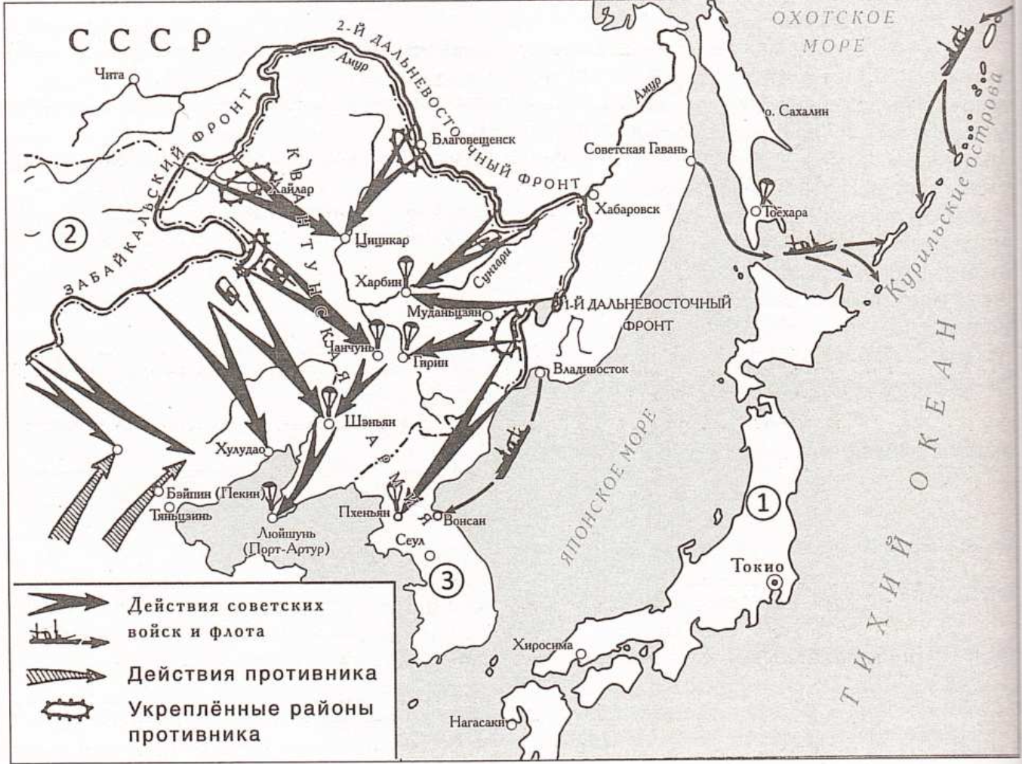 «9 августа по приказу Верховного Главнокомандования советские вооружённые силы начали боевые действия на Дальнем Востоке одновременно на всём фронте протяжением около 4 тысяч км. Стратегический план Ставки Верховного Главнокомандования отличался решительностью замысла и целеустремленностью. План предусматривал одновременное нанесение сокрушительных ударов по войскам противника, находившимся в Маньчжурии и Корее, с трёх направлений. Войска 2-го Дальневосточного фронта имели задачу главными силами начать наступление из района юго-западнее Хабаровска и во взаимодействии с Амурской флотилией развивать наступление вдоль р. Сунгари в общем направлении на Харбин. Одновременно они должны были форсировать Амур в районе Благовещенска и отсюда наносить удар на _________».