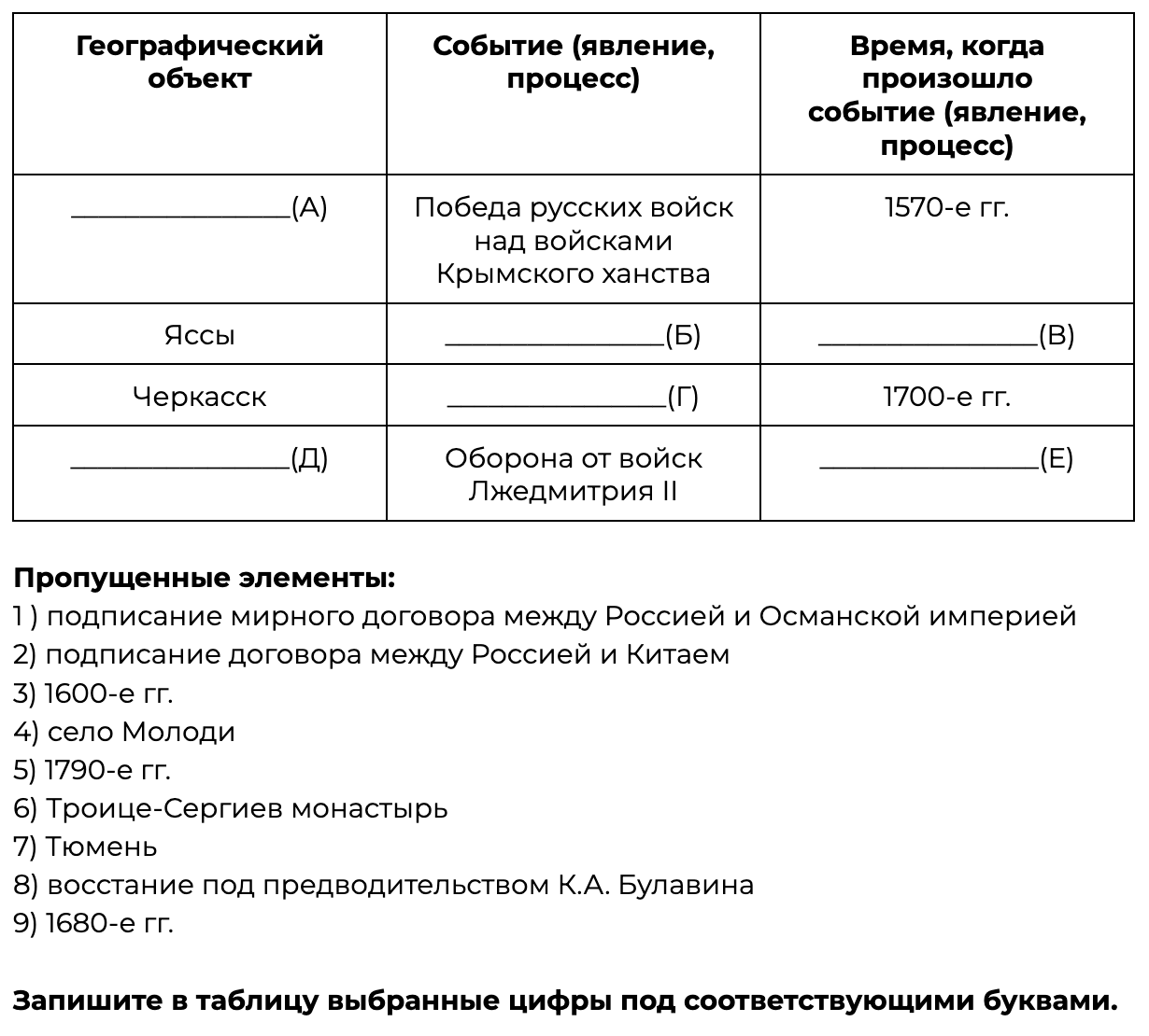 Заполните пустые ячейки таблицы, используя приведённый ниже список пропущенных элементов: для каждого пропуска, обозначенного буквой, выберите номер нужного элемента.