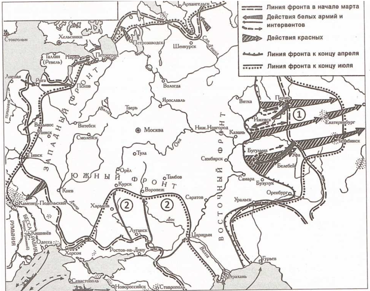 Напишите фамилию главнокомандующего войсками белых, которые действовали в районе, обозначенном на схеме цифрой «1».