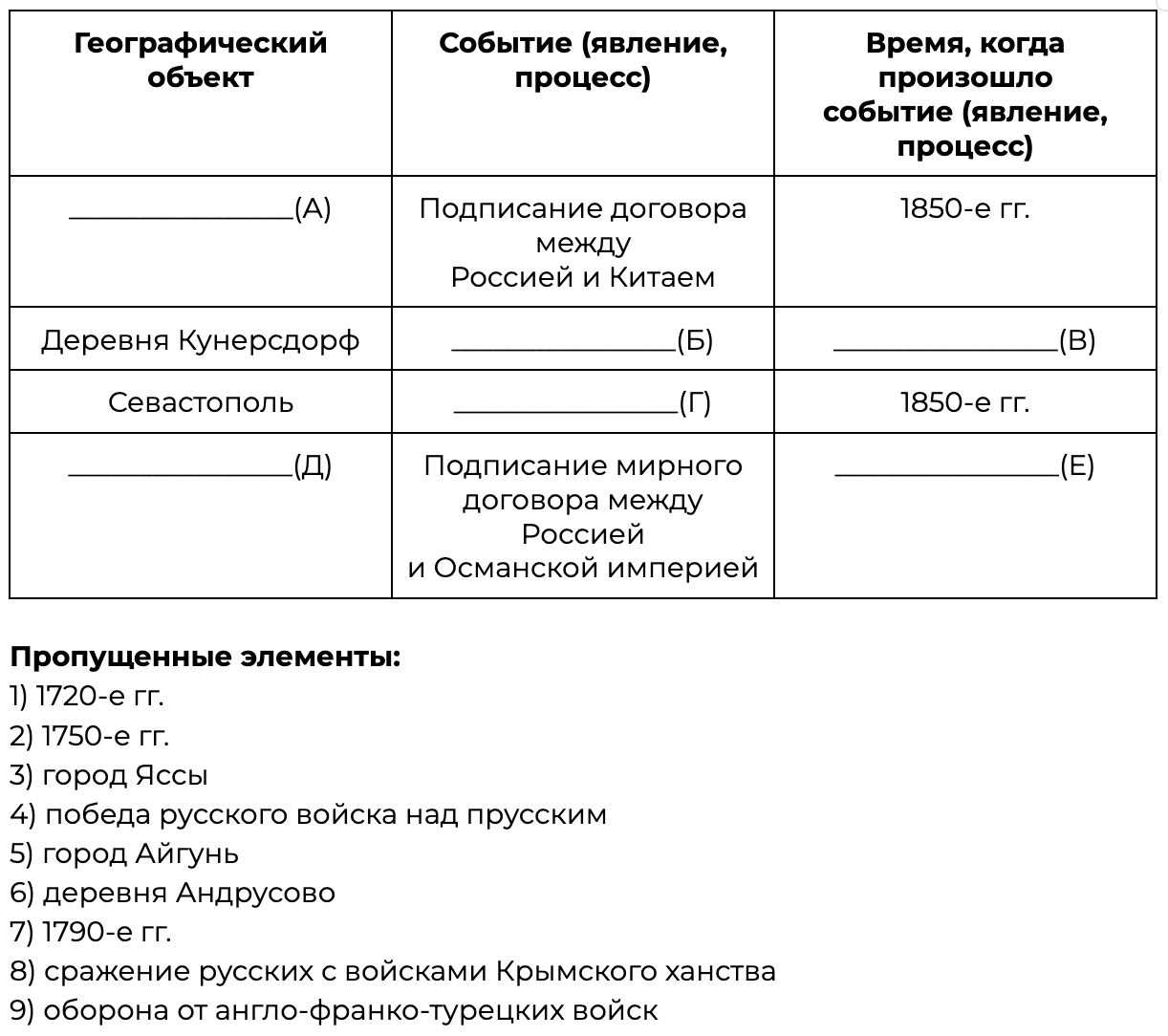 Заполните пустые ячейки таблицы, используя приведённый ниже список пропущенных элементов: для каждого пропуска, обозначенного буквой, выберите номер нужного элемента.