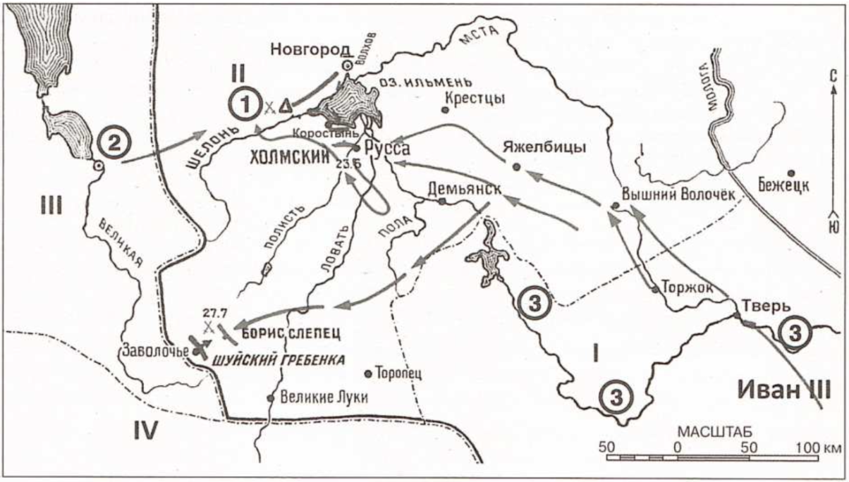 «Путь московского войска на Новгород пролегал через города Тверь, Торжок, _________• Свою ставку великий князь разместил в Яжелбицах, в то время как основные силы (порядка 10 тысяч человек), возглавляемые княжеским воеводой Даниилом Холмским, двинулись в обход Ильменского озера с юга на город Руссу. В тот год в Приильменской низменности имела место сильная засуха: всё лето не наблюдалось дождей, и болота высохли, что позволяло войскам московского князя беспрепятственно продвигаться по прямому пути».