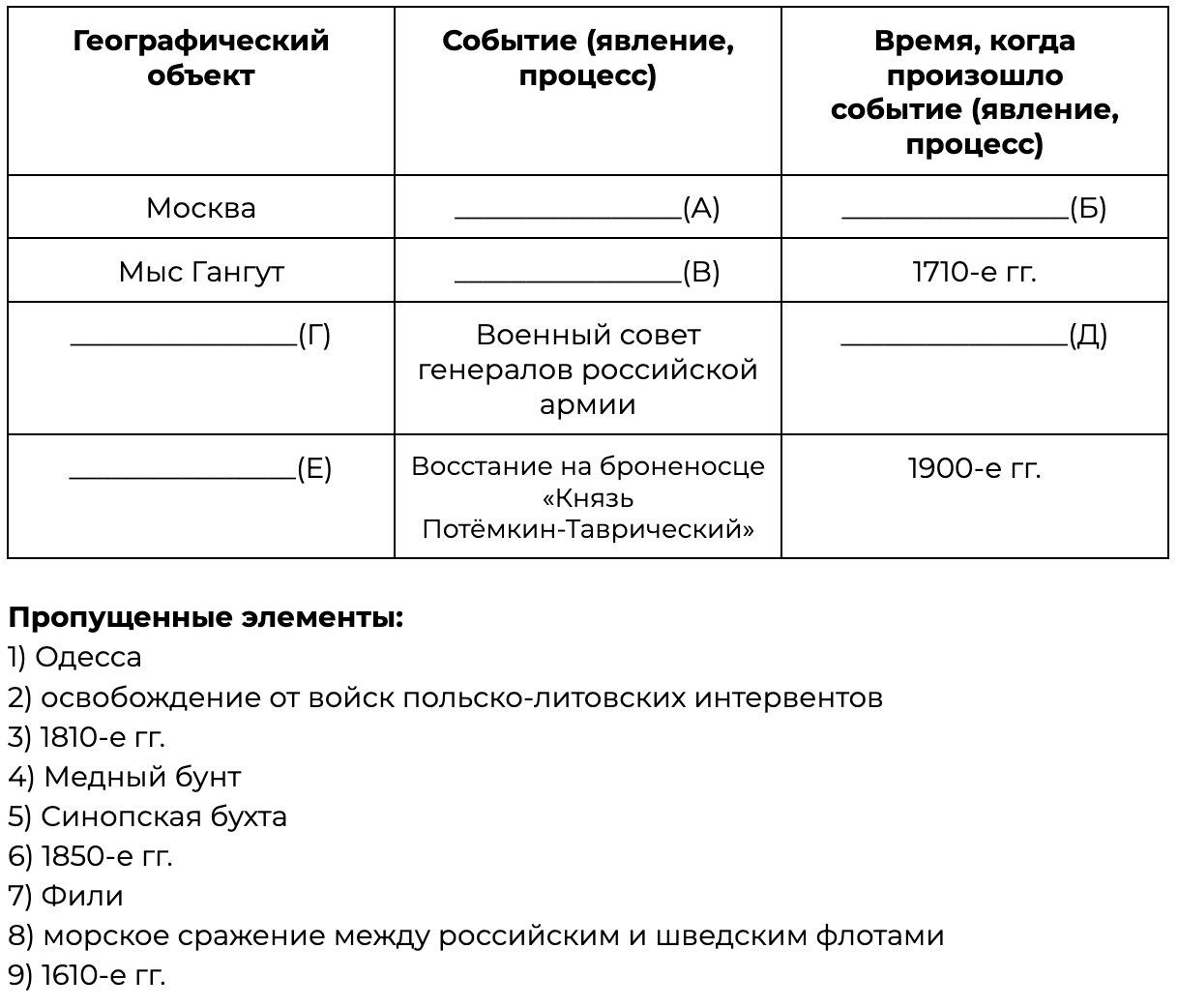 Заполните пустые ячейки таблицы, используя приведённый ниже список пропущенных элементов: для каждого пропуска, обозначенного буквой, выберите номер нужного элемента.