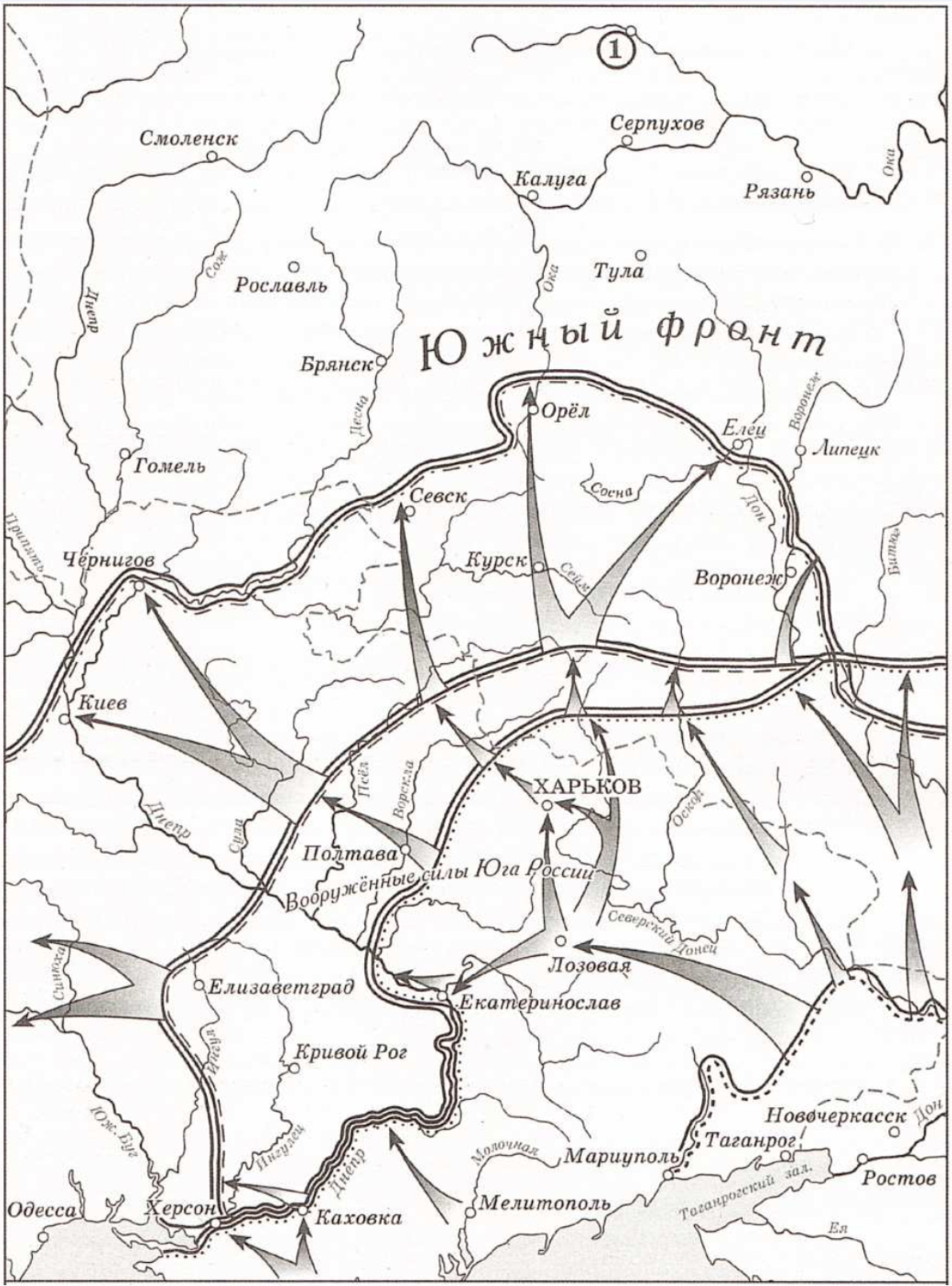 «Выявившееся к середине сентября полное поражение августовского наступления большевиков побудило главнокомандующего Вооружёнными силами Юга России отдать 12 сентября директиву о переходе армии в общее наступление. Наступление должно было осуществляться по кратчайшему, центральному маршруту и проходить в два этапа: достижение рубежа Севск — Орёл — ___________ и оттуда концентрическое наступление на Москву. В течение 12 сентября - 19 октября план главнокомандующего осуществлялся с исключительным успехом. Создавалось впечатление, что Южный фронт красных развалился. В особенности первые две недели наступления были подлинным триумфом белых, которым практически не оказывалось сопротивления. На центральном направлении 20—21 сентября белые овладели Курском, 13 октября вступили в Орёл».