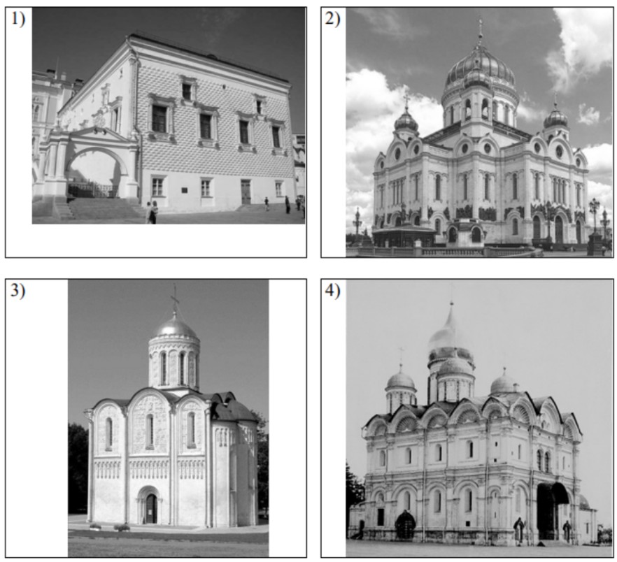 Какой из представленных ниже памятников архитектуры был уже создан к моменту, когда произошло событие, юбилею которого посвящена данная марка? В ответе запишите цифру, которой обозначен этот памятник архитектуры. Назовите город, где находится данный памятник архитектуры.