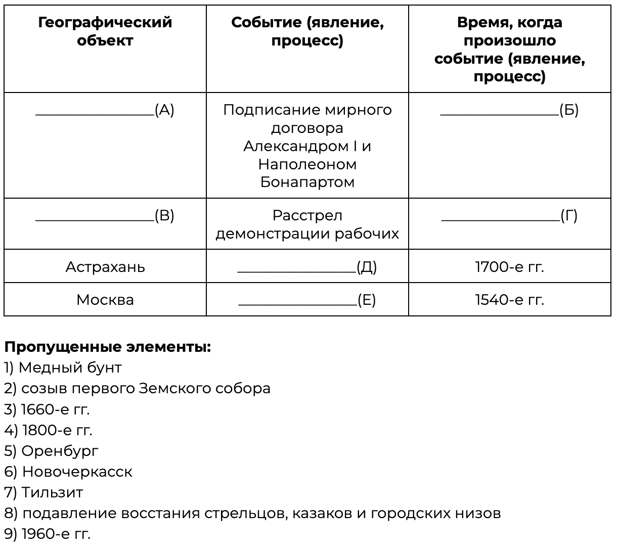 Заполните пустые ячейки таблицы, используя приведённый ниже список пропущенных элементов: для каждого пропуска, обозначенного буквой, выберите номер нужного элемента.