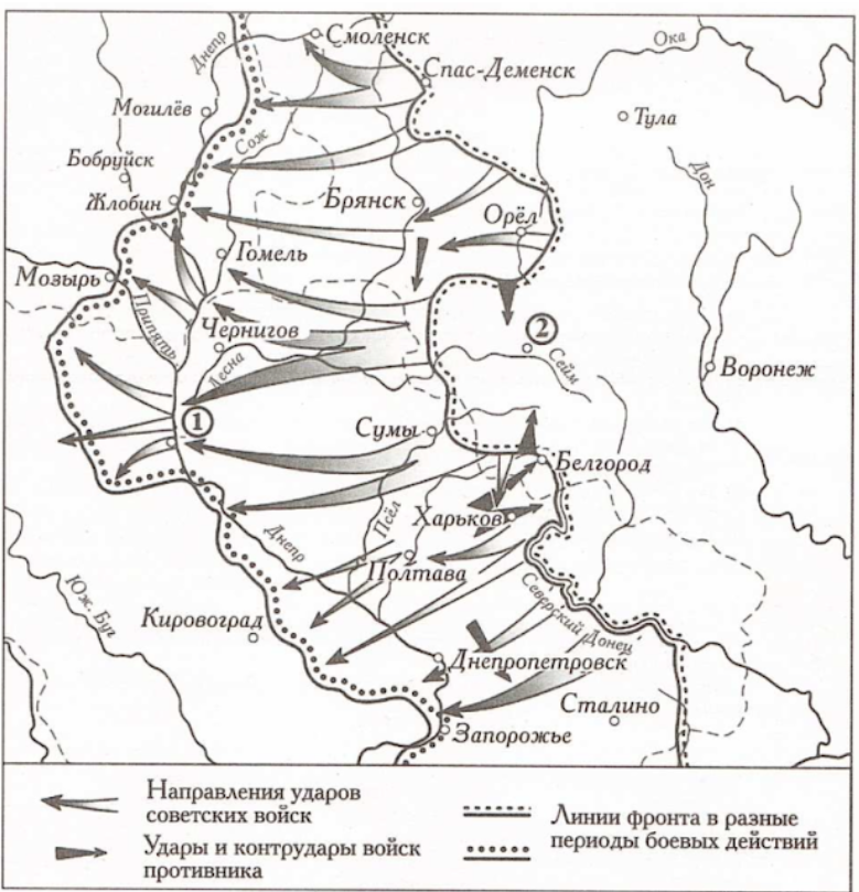 «19 июля Степной фронт был введён в контрнаступление на Белгородско- Харьковском направлении. В ходе контрнаступления войска фронта преодолели глубоко эшелонированную оборону противника, овладели Белгородом и 23 августа взяли штурмом Харьков. Разгром немцев под Харьковом и Мерефой открыл войскам фронта путь на __________________ и далее к Днепру. Перед войсками была поставлена задача нанести удар в направлении ____________________, выйти на среднее течение Днепра, форсировать его и обеспечить плацдармы для развёртывания сил на Правобережной Украине».