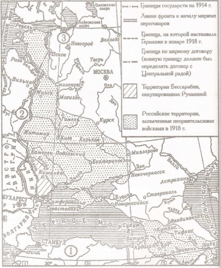 Укажите название города, обозначенного на схеме цифрой «3», в период, когда был подписан мирный договор, изменения границ по которому отражены на схеме.