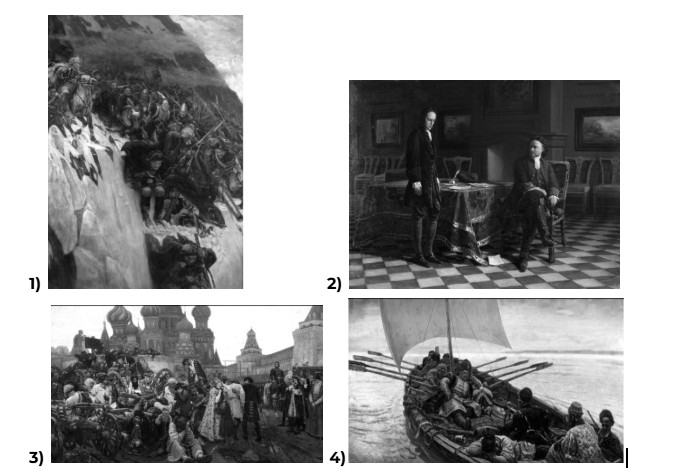Какое из произведений живописи посвящено событию, произошедшему в том же десятилетии, когда был основан город, юбилею которого посвящена марка? В ответе запишите цифру, которой обозначено это произведение живописи. Укажите художника, создавшего данное произведение живописи.