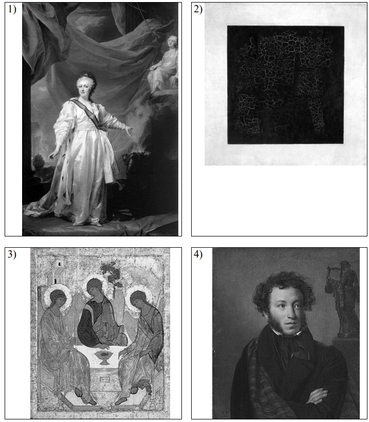 Какое из представленных произведений живописи было создано в период правления одного из государей, изображённых на лицевой стороне монеты? В ответе запишите цифру, которой обозначено это произведение. Укажите автора этого произведения.