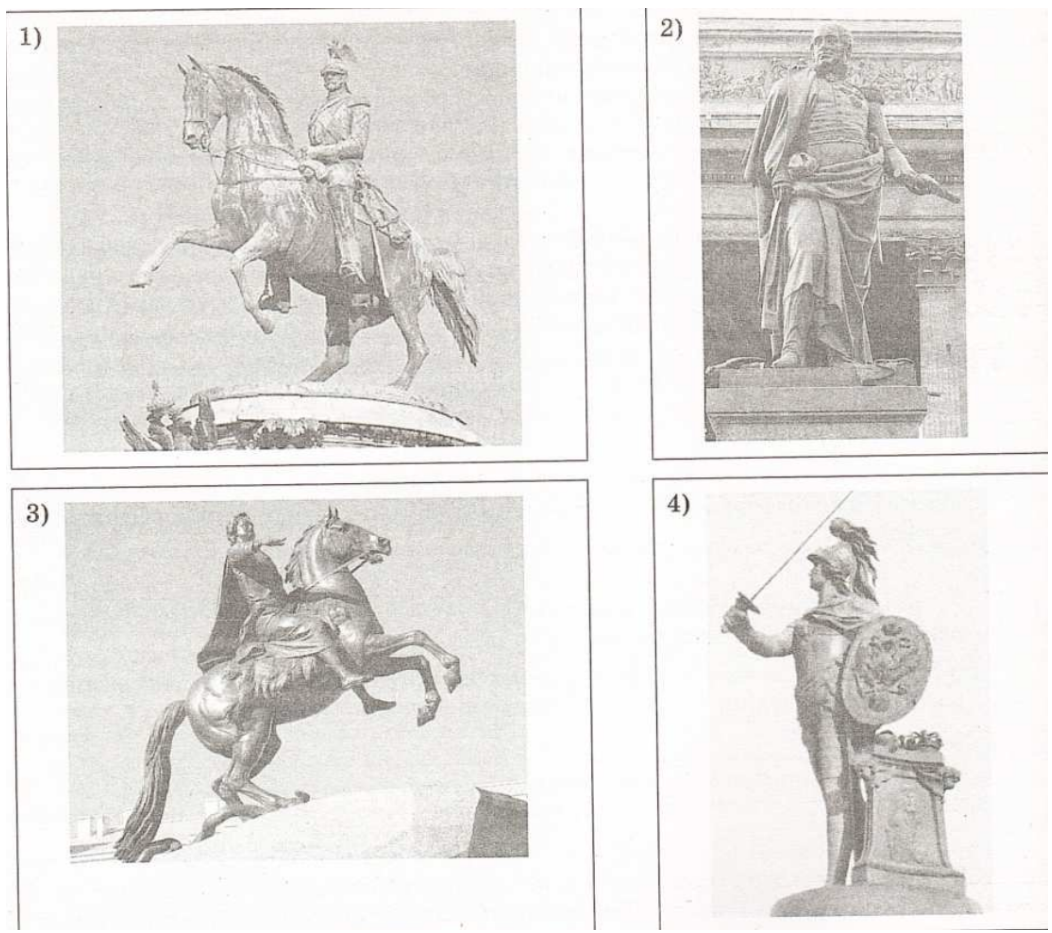 Какой из представленных скульптурных памятников посвящён монарху, правившему в период, когда произошло событие, юбилею которого посвящена данная памятная медаль? В ответе запишите цифру, которой обозначен этот скульптурный памятник. Назовите монарха, в период правления которого был создан этот скульптурный памятник.